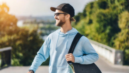 Portrait of a young handsome guy walking in the park with a skateboard. Summer walks.