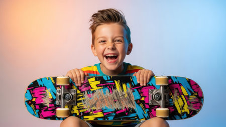 A young boy holds a colorful skateboard, radiating happiness with a wide smile. The vibrant skateboard complements his colorful shirt. The composition is set against a gradient background of blue and orange, suggesting an indoor setting with diffused lighting. This image could be suitable for various commercial projects related to childhood, recreation, or lifestyle.