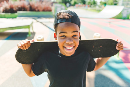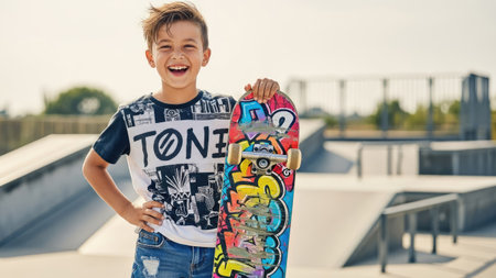 A young boy stands confidently, holding a skateboard. The scene takes place outdoors on a bright day, featuring a skatepark with ramps. The boy is wearing a graphic tee and denim shorts. This image is suitable for various commercial purposes, including advertising and editorial content.