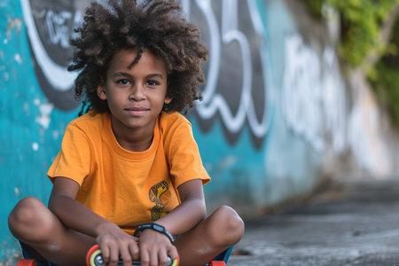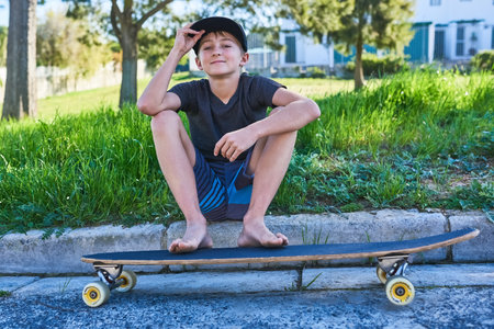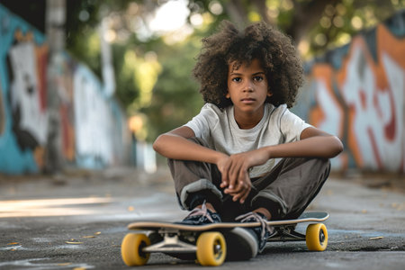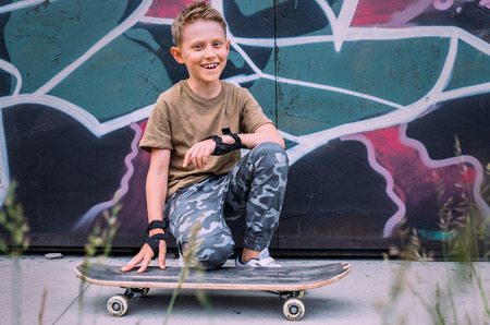 Portrait of Serious Young Boy Wearing Elbow Pads and Baseball Cap Sitting on Skateboard in Urban Setting with Graffiti Covered Wall in Background