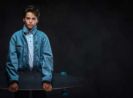 Fashionable young guy dressed in a t-shirt and denim jacket holds a longboard.