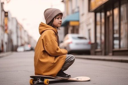 a young boy sitting on a skateboard in the middle of an urban street, wearing a beanie hat