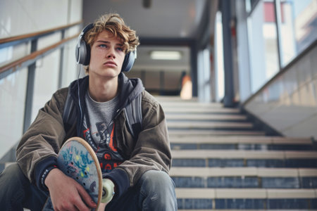 Teenage boy with headphones on stairs, holding skateboard, thoughtful expression.