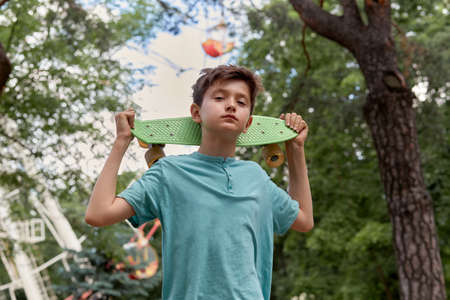 Outdoor activities for children. A cheerful young boy in a capcstay with a skateboard in a public park. Caucasian schoolboy on a walk. Front view