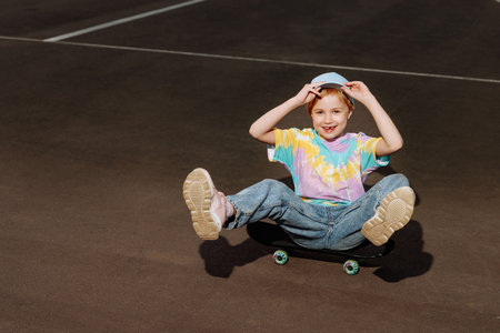 Beautiful little girl is having fun with her skateboard on the skate park.