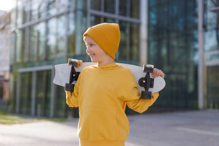 Joyful skater boy 7-8 years with skateboard on his shoulders. Outdoors activities concept