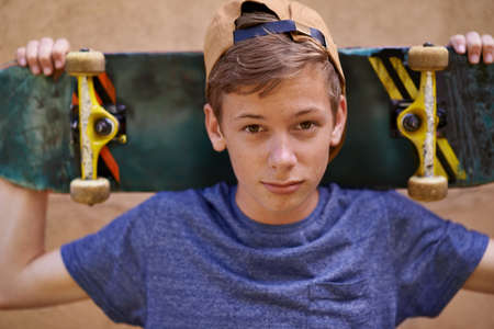I know a few good tricks. Portrait of a teenage boy holding his skateboard while standing against a wall.