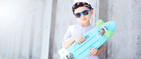 Stylish boy child in street clothes in a T-shirt, bandana, blue sunglasses and black and white sneakers with a turquoise skateboard in his hands against the background of a concrete wall.