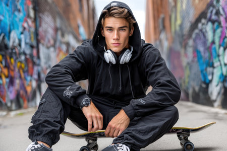 A young man sits on his skateboard wearing casual streetwear, headphones around his neck, in an alley.