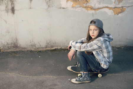 Happy skateboarder sitting on skate. Young active people. Outdoors.