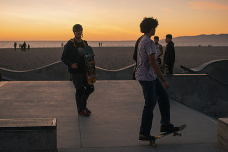 Skateboarder at sunset Venice Skateboard Park in Venice Beach, CA United States