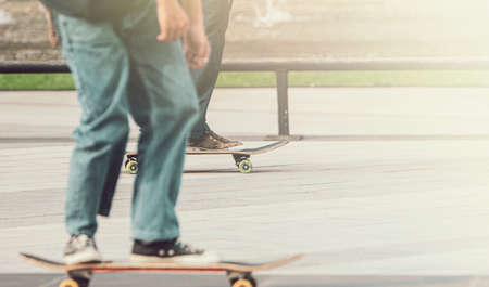 Friends of the men's company hold their hands skateboards. Concept group of street athletes students. Motion blur effect. Bright sunlight.