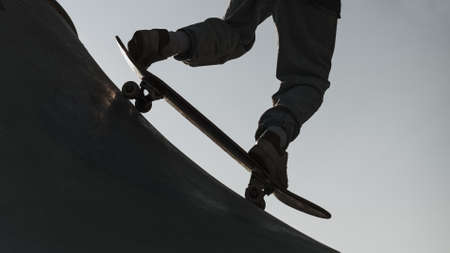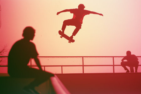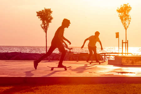 teenager having fun with skateboard park silhouette. High quality beautiful photo concept
