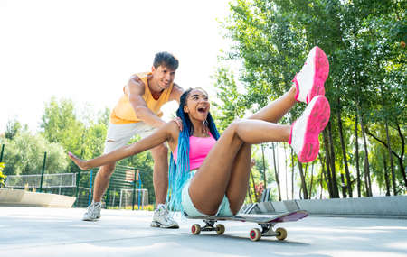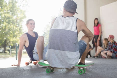 Multiracial friends laughing and talking while riding in skate park on summer day