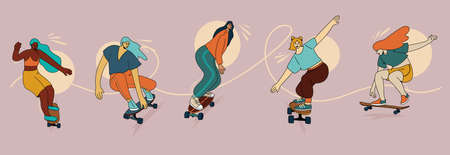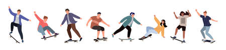 Set of diverse people riding a skateboard. Colored flat vector illustration of skateboarders in different poses isolated on white background