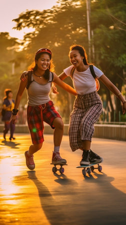 A group of young people riding skateboards together at a local skate park, A group of teenagers laughing at a skateboard park, AI Generated
