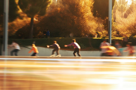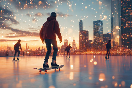 Skaters navigate a smooth surface in a bustling city during a stunning sunset, surrounded by bright lights.