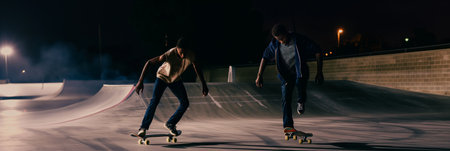 Nighttime Skateboarding Session Two Friends Enjoying Skate Park After Dark.