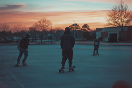 Group of friends enjoying skateboarding together during a colorful sunset in a deserted parking lot