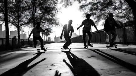 Group of friends skateboarders go in for sports on the street and ride skateboards, shoes in holes and abrasions. The concept is to lead the team to victory. Monochrome and high contrast.