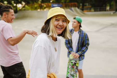 Group of young adults, enjoying leisure in skatepark, conversing with city skyline in background