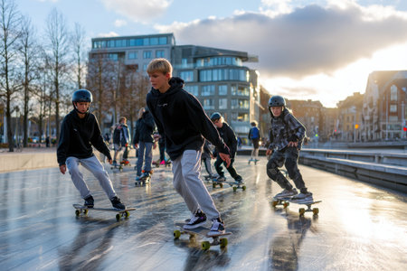 A group of young skateboarders showcase their skills on a smooth surface during sunset.
