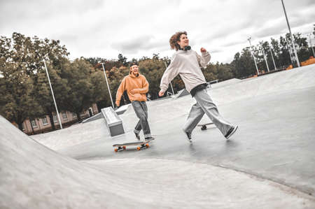 Always skating together Full length of young people skateboarding while hanging out at the skate park outdoors : Generative AI