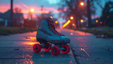 A lone roller skate rests on a wet city sidewalk as the last light of a vibrant sunset fades.