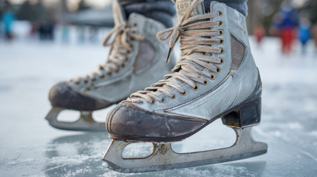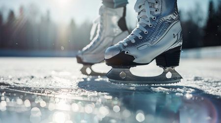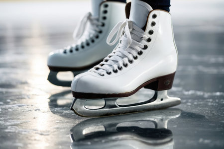 A close-up view of white ice skates gracefully positioned on a sparkling ice surface