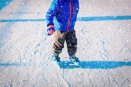 little boy skating on ice in winter