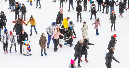 KYIV, UKRAINE - Jan. 03, 2021: Ice-skating people. People have fun in ice arena at the city ice rink. New Years holidays in city Kyiv.