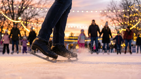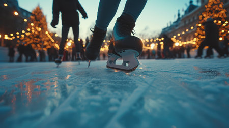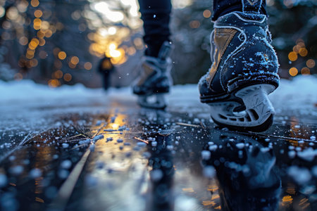 Bright yellow ice skates glide effortlessly across a glossy frozen pond. Reflections from colorful lights create a magical atmosphere, highlighting the joy of skating in a winter wonderland.