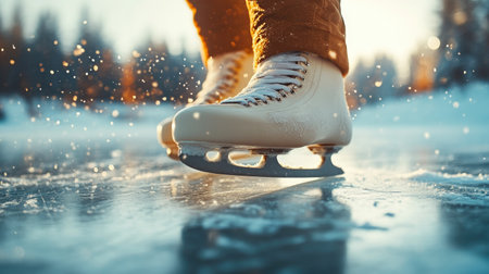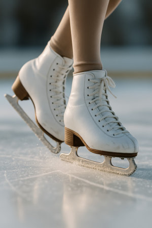 A close-up view of white ice skates gracefully positioned on a sparkling ice surface