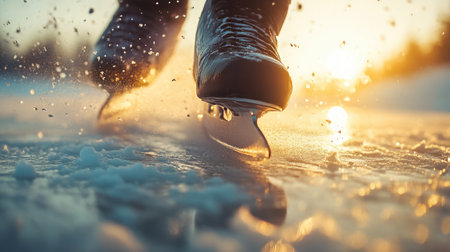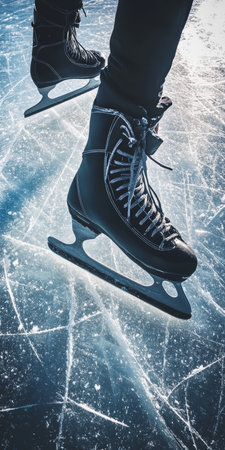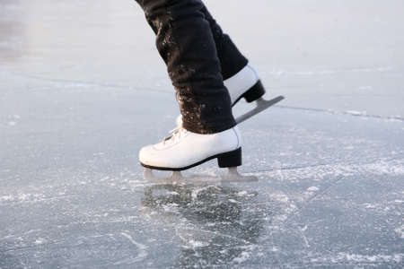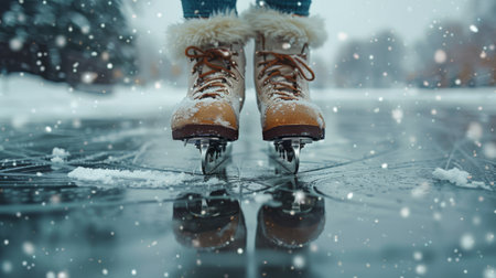 The feet of an ice skater, clad in skates, glide across the frozen surface of an ice rink, capturing the motion and chill of the sport