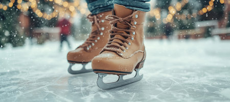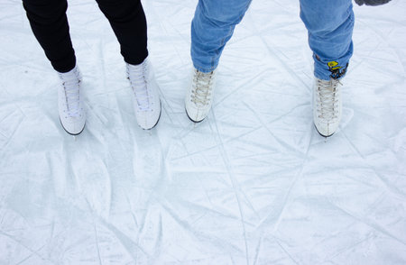 close-up of female feet ice skating in winter on an outdoor ice rink. Ice skates of two friends ice skating together on a winter day. Winter time, outdoor activities, winter leisure concept