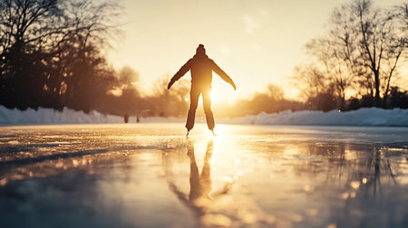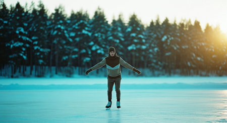Ice skater gliding gracefully across a frozen lake, embracing the freedom of winter while enjoying a stunning sunset. Snow-covered trees frame the serene landscape, creating a picturesque scene
