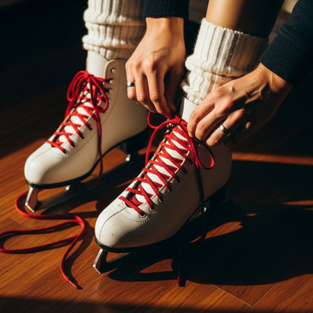 Woman tying ice skates on wooden floor. Winter sport concept.