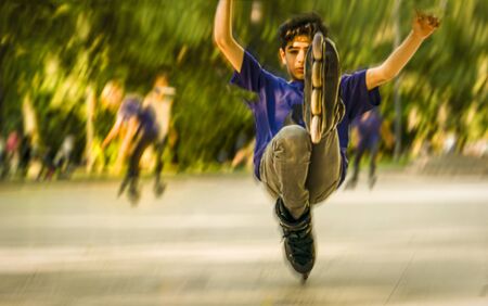 Ankara/Turkey-June 23 2019: Abstract blurred boy plays the trick on the roller skates. Rides on one leg in a squat