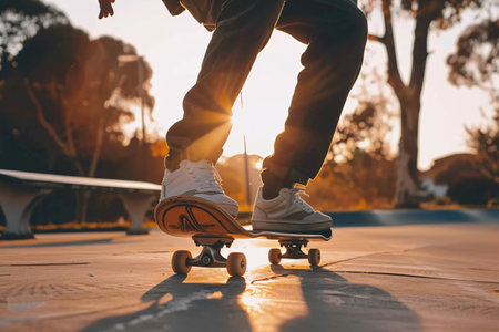A skater moves quickly along a paved path, enjoying the vibrant sunset and a sense of freedom.