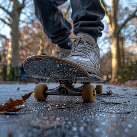 A skillful skateboarder performs tricks on a wet street with fallen leaves. Close-up shot shows foot on skateboard, wearing sneakers with yellow wheels. Background features blurred distant trees.@240804_