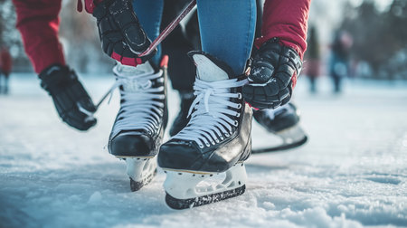 Individuals putting on ice skates on a snowy rink during winter in a lively outdoor skating area with friends and family
