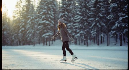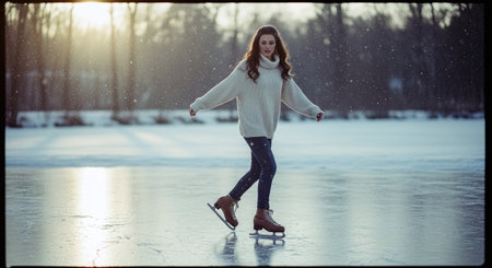 A young woman ice skating on a frozen lake surrounded by snow-covered trees, wearing a cozy sweater and hat, with sunlight filtering through the trees