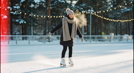 A young woman skating on an outdoor ice rink in winter, wearing a warm coat, scarf, and hat, surrounded by snow and festive lights