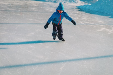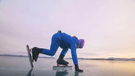 The child train on ice speed skating. The athlete at the start, in a sports stance. The kid girl skates in the winter in sportswear, sport glasses.