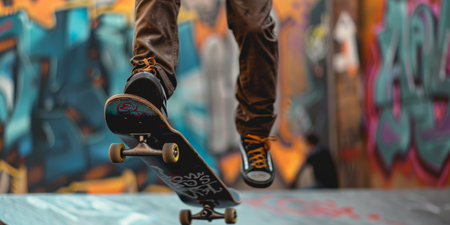 A skateboarder is in mid-air, performing a trick on a skateboard. The skateboard is black and has graffiti on it. Concept of excitement and adrenaline, as the skateboarder is captured in action