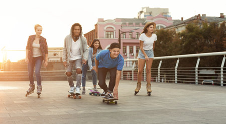 Diverse Teen Friends Riding on Skateboards and Rollers