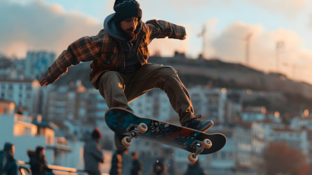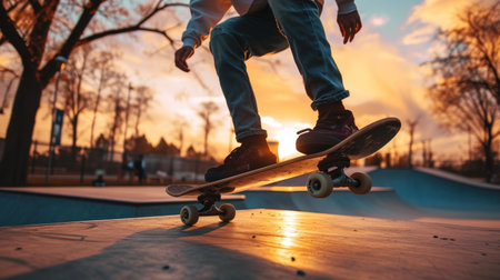 Skateboarder performing a trick on a ramp against a beautiful sunset backdrop in a skate park