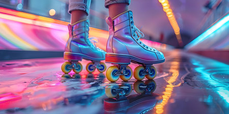Neon Roller Skates on a Disco-Themed Background. Concept Disco Theme, Neon Skates, Roller Skating, Vibrant Colors, Retro Aesthetics