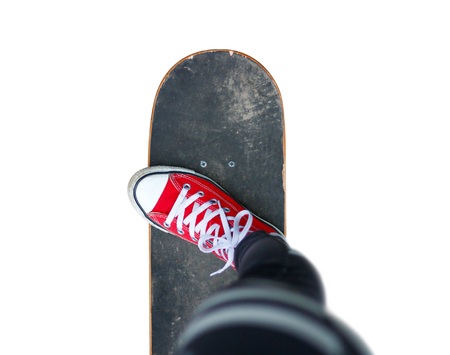 Girl in red sneakers on a skateboard. Feet on a skateboard. First person. Isolated on white background