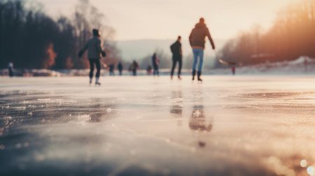 Group of people ice skating in city park, at sunset or sunrise. Healthy outdoor winter activity